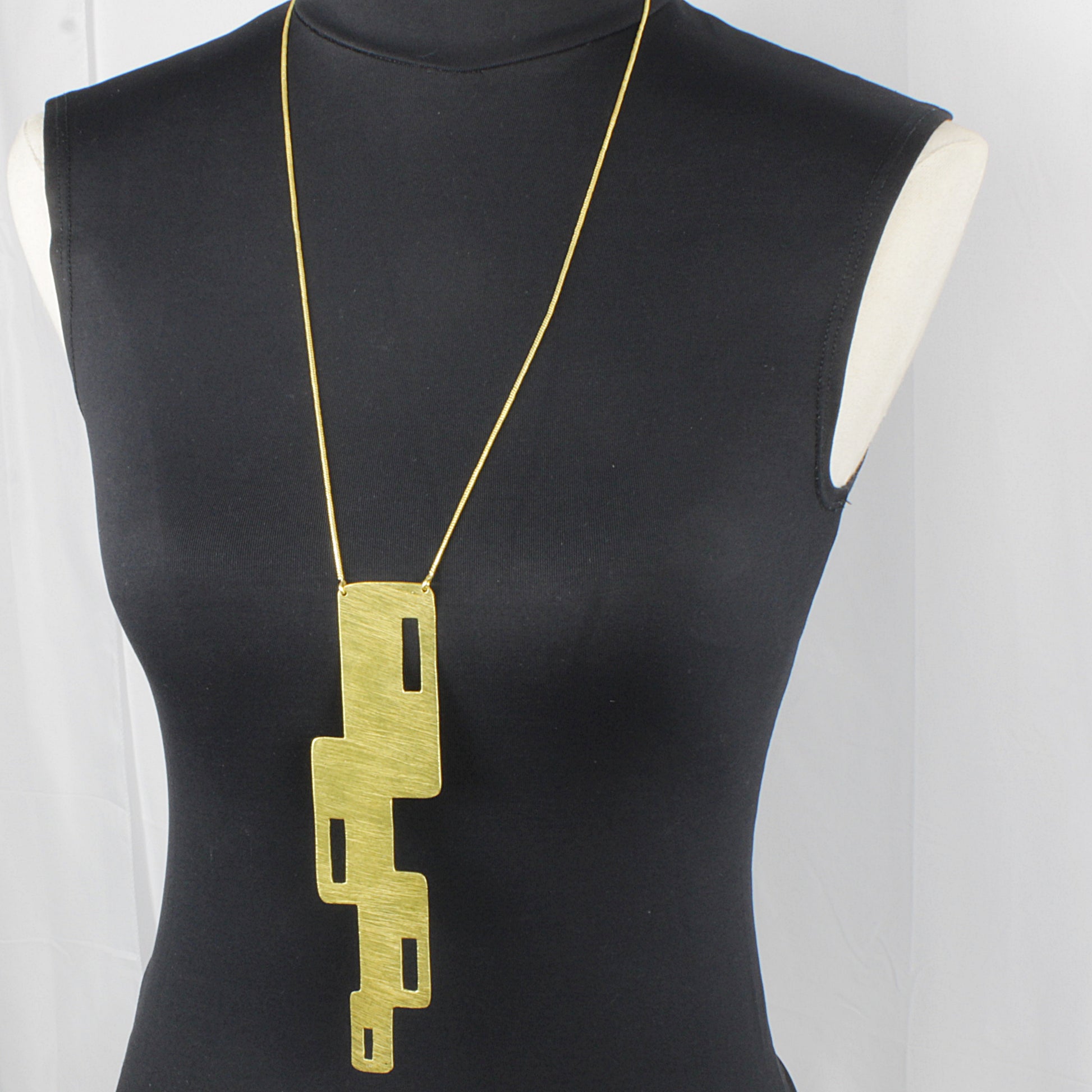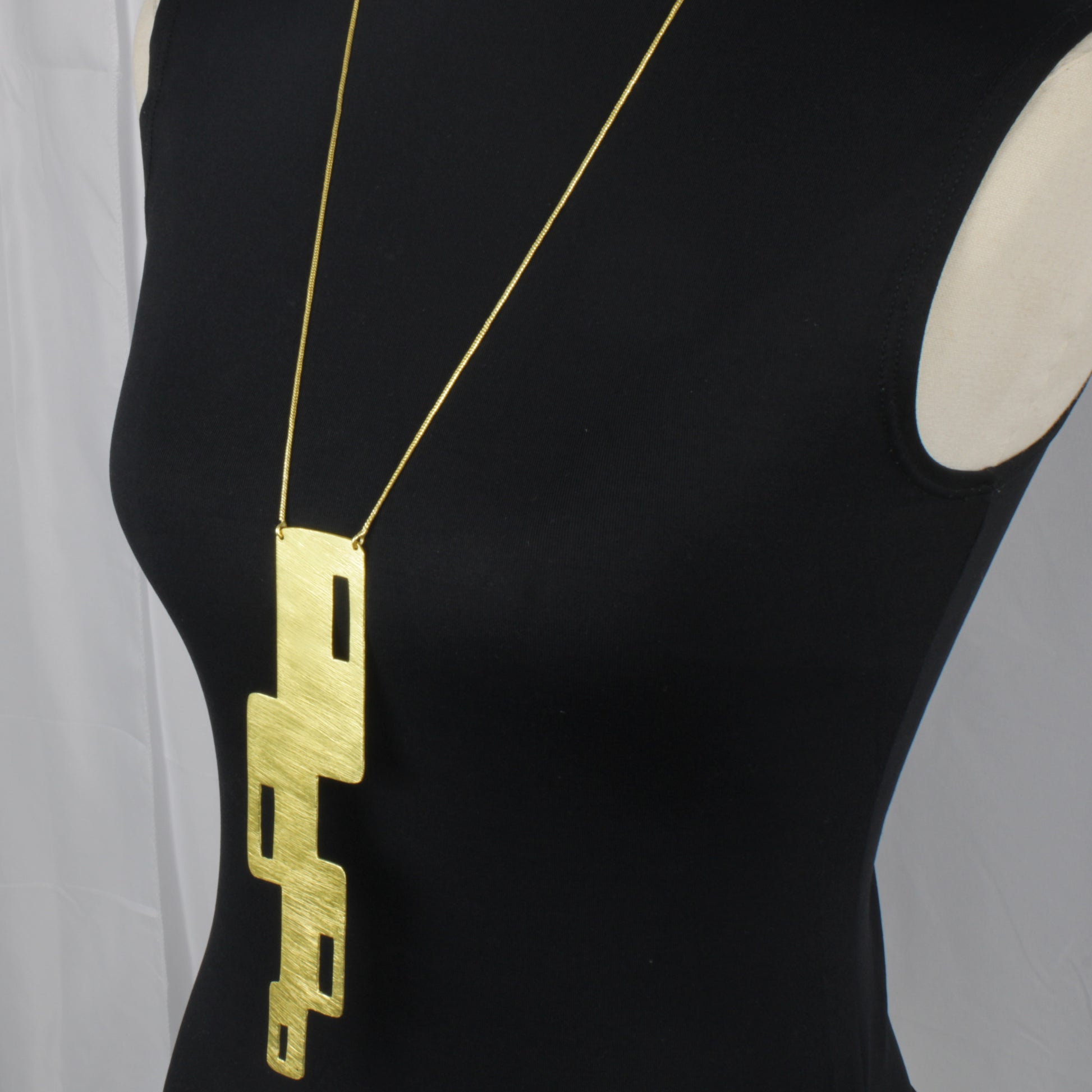Collar CUBÉ de diseño, es un collar largo hecho de una sola pieza inspirado en el arte moderno y el cubismo, hecho en latón y bañado en oro 18 Kt libre de níquel. Hipoalergénico.