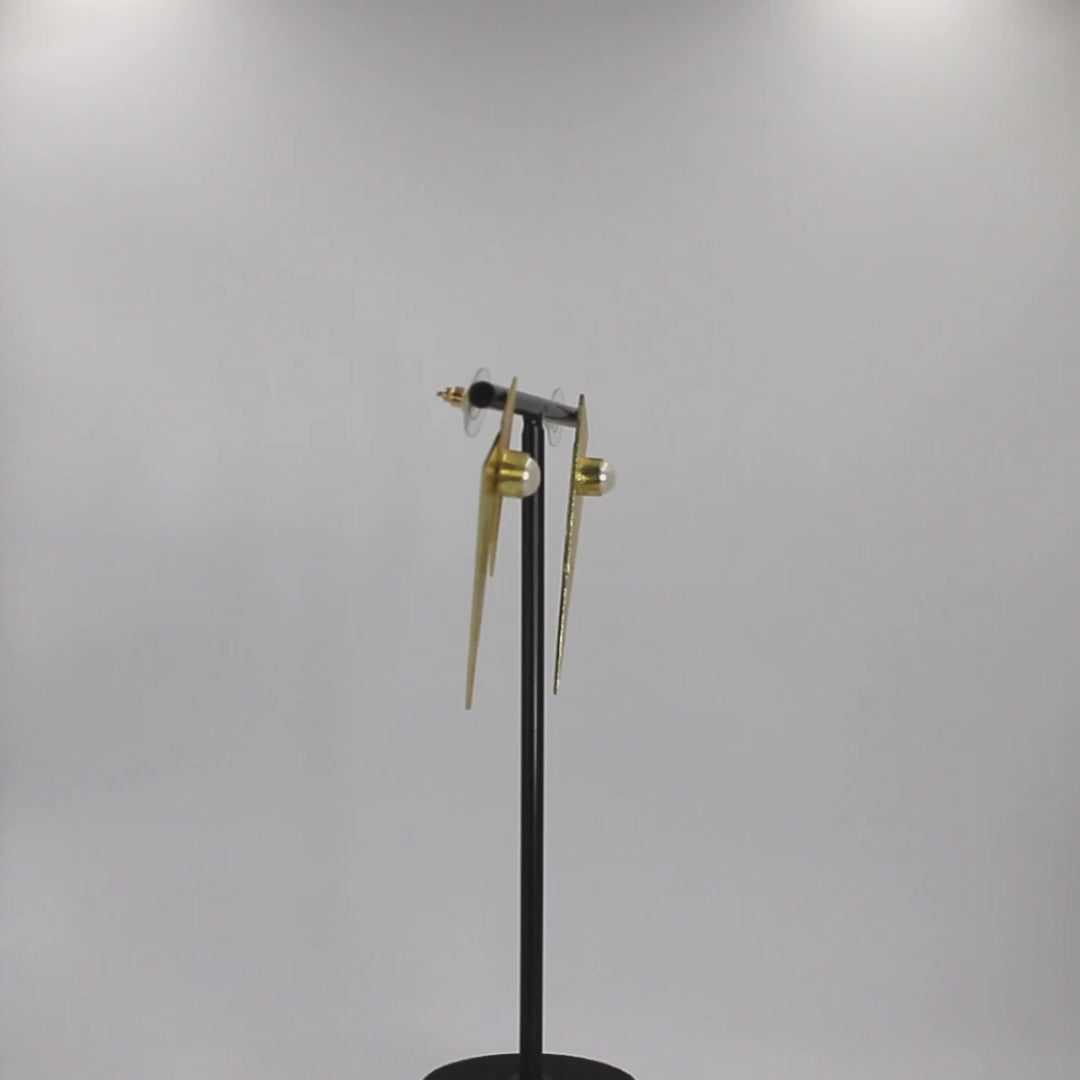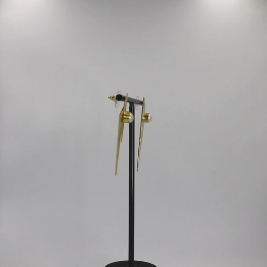 Pendientes BOWIE, fusión entre los años 80 y el Art Déco, hechos en latón, baño de oro 18 kt, sin níquel, hechos a mano. Hipoalergénicos. Diseño geométrico que consta de dos triángulos superpuestos con detalle de perlas sintéticas.