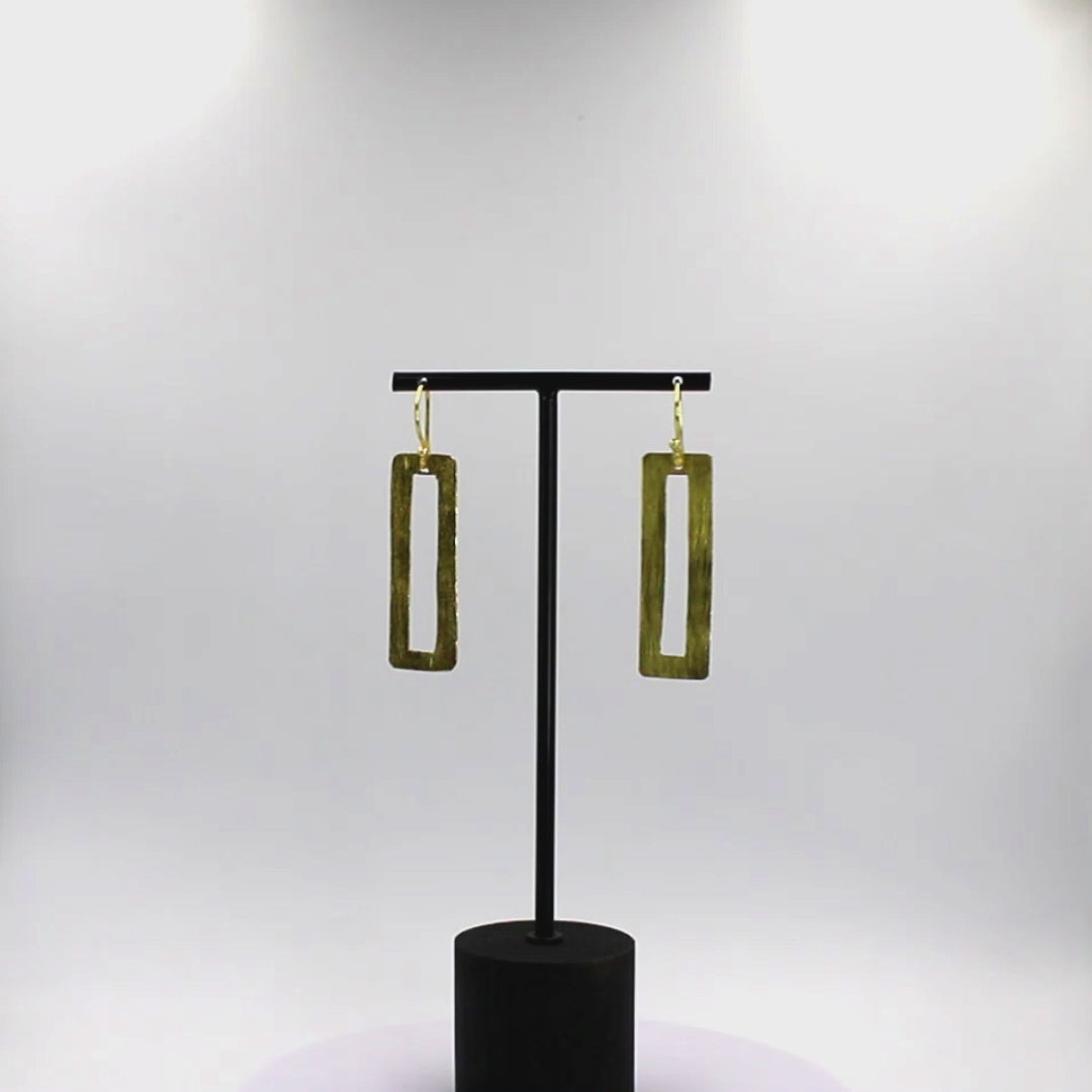 Pendientes SAETERA inspirados en las aberturas verticales de los castillos de la edad media. Hechos en latón, bañado en oro 18 kt, sin níquel. Hipoalergénicos. La unión con el gancho de cierre permite movimiento.